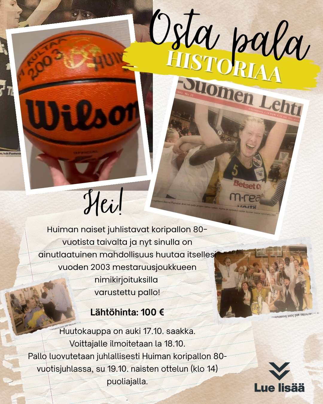 Huiman naiset juhlistavat koripallon 80-vuotista taivalta Äänekoskella, ja juhlan kunniaksi on avattu erityinen huutokauppa.